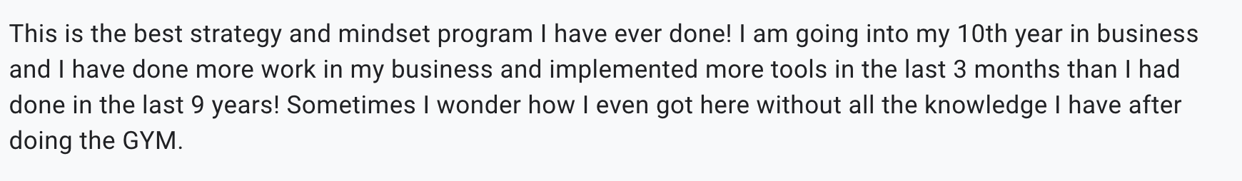I don’t want you to find an excuse to opt out. You’re getting in the G.Y.M. because you’re fed up of wasting time and want to make real progress. I don’t offer refunds, because if you follow the program you will get all the deliverables: A strategy, a plan, systems, and a funnel.
